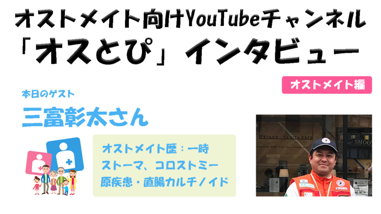 今回はゲストに、「オストメイト歴:一時ストーマ/コロストミー/原疾患:直腸カルチノイド」の三富彰太さんをお迎えして、いろんなお話を聞いていきたいと思います。
