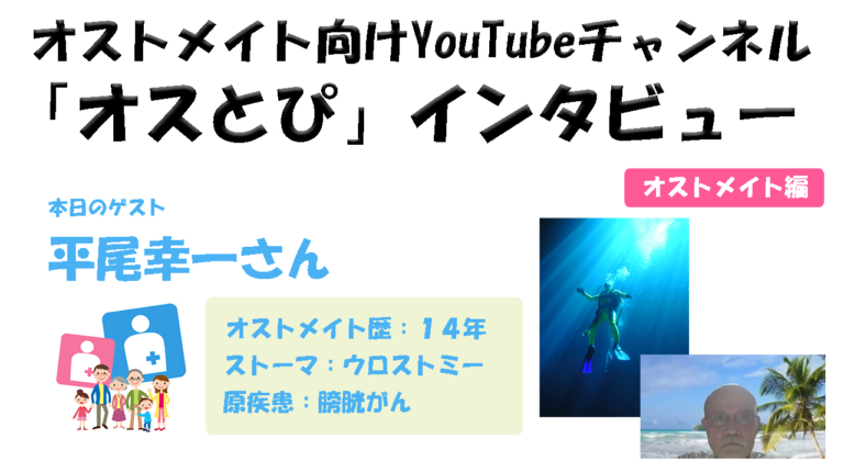今回はゲストに、「オストメイト歴約14年/ウロストミー/原疾患:膀胱がん」の平尾幸一さんをお迎えして、いろんなお話を聞いていきたいと思います。